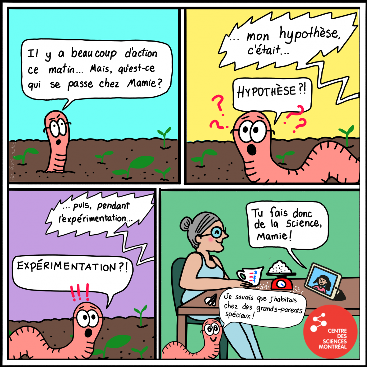 Enfin, nous avons retenu la démarche scientifique de Lorraine, la grand-mère de Béatrice Sarrazin. Lorraine s'est demandé si on obtient la même quantité de farine en plongeant la tasse à mesurer directement dans le sac ou en remplissant la tasse à l’aide d’une cuillère. Son hypothèse était qu'en déposant la farine avec une cuillère il y aurait de l'air entre les particules de farine et que la quantité mesurée ne suffirait pas. Après expérimentation, Lorraine a conclu que la recette est mieux réussie en utilisant une cuillère pour déposer la farine dans la tasse à mesurer. Se poser des questions, établir des hypothèses et expérimenter: cela fait partie de la démarche scientifique.